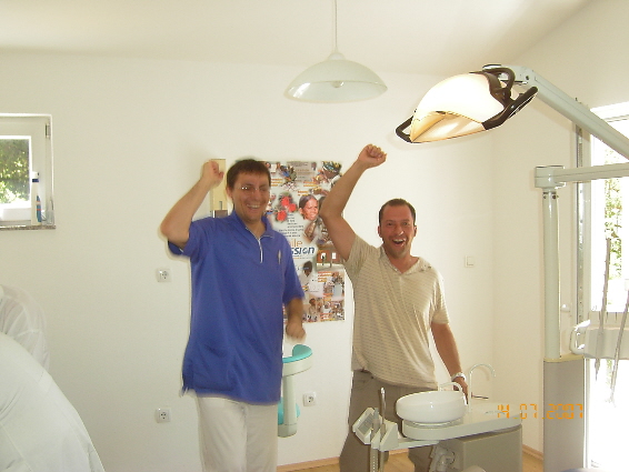 14/07 Ultimo giorno lavorativo. Come spesso succede in uno studio prima delle “ferie”, qualcosa si rompe. Questa volta a non funzionare più è stato il riunito. Che peccato, proprio allora che l’aspiratore funzionava! Eravamo bloccati, non si poteva questa volta far più nulla eccetto un controllo di un paziente trattato la settimana precedente sebbene la poltrona fosse bloccata in una posizione scomoda e di difficile raggiungimento per il paziente. Per fortuna era solo il fusibile che un volontario elettricista, il Sg. Maurizio, gentilmente ci procura. Il pomeriggio tuttavia non è potuto venire nessun paziente; si è rimediato con un altro paziente disponibile e così con lui e con l’ultimo riordino è terminata la nostra missione. In ultimo la sera prima di ripartire, c’è stata una splendida cena preparata dalle gentili volontarie la sg.ra Rosa e la sg.ra Pietrina, e il saluto e benedizione del p. Silvano. Anche la poltrona è “stanca” nell’ultimo giorno di missione: l’elettricista verifica il fusibile
